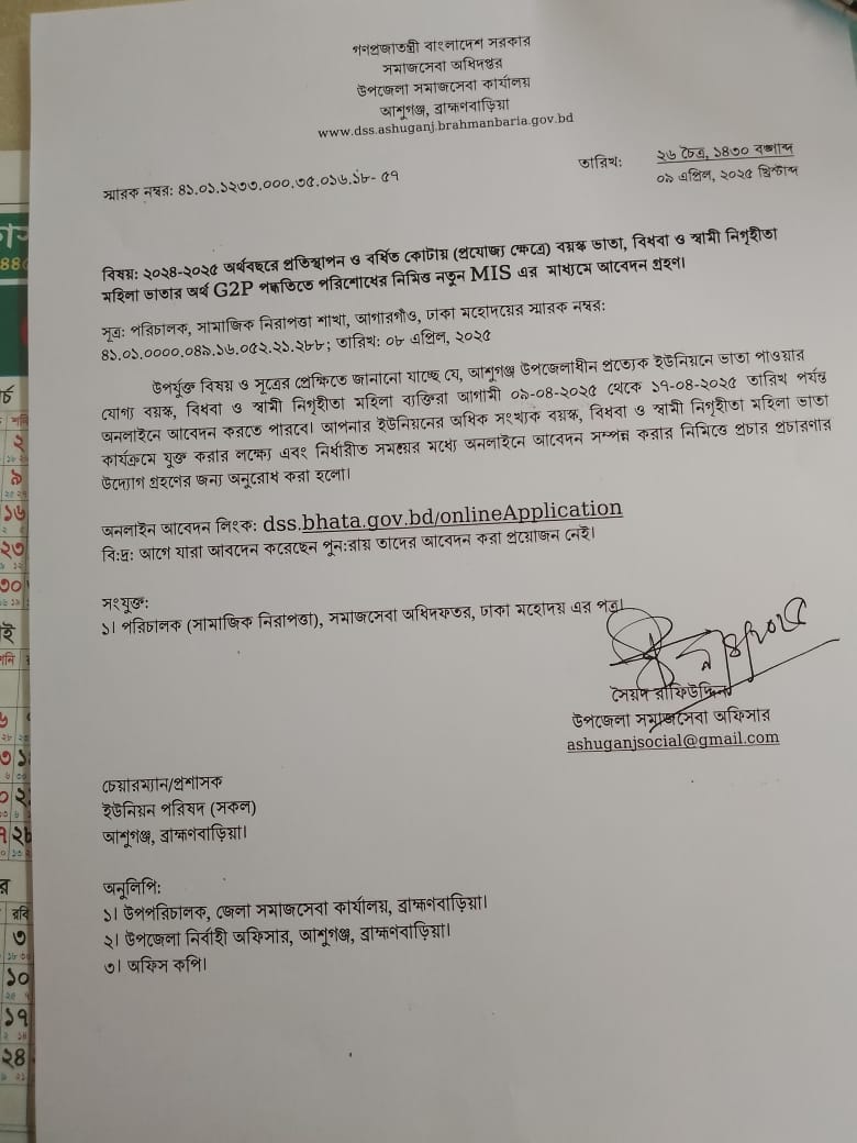 | ২ | ২০২৪-২০২৫ অর্থবছরে প্রতিস্থাপন ও বর্ধিত কোটায় (প্রযোজ্য ক্ষেত্রে) বয়স্ক ভাতা, বিধবা ও স্বামী নিগৃহীত মহিলা ভাতার অর্থ g2p পদ্ধতিতে পরিশোধের নিমিত্ত নতুন mis এর মাধ্যমে আবেদন গ্রহণ। | | ১৫-০৪-২০২৫ | দেখুন | |